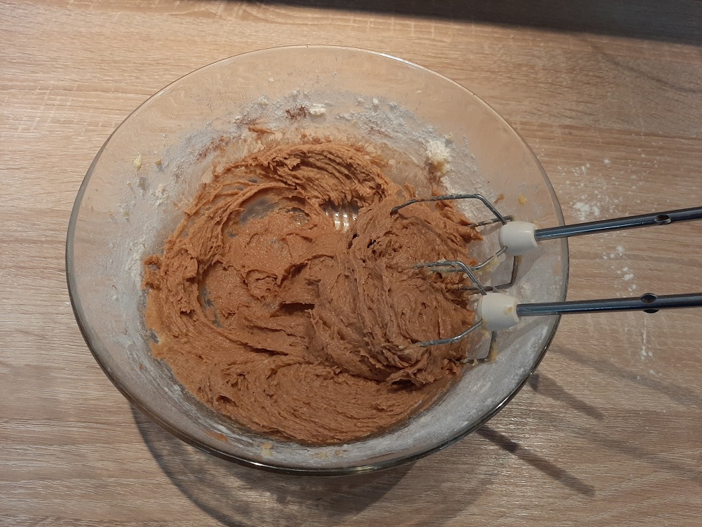 - Une fois que le tout est bien mélangé, ajouter le jaune d’œuf et enfin la farine et le cacao en poudre ;