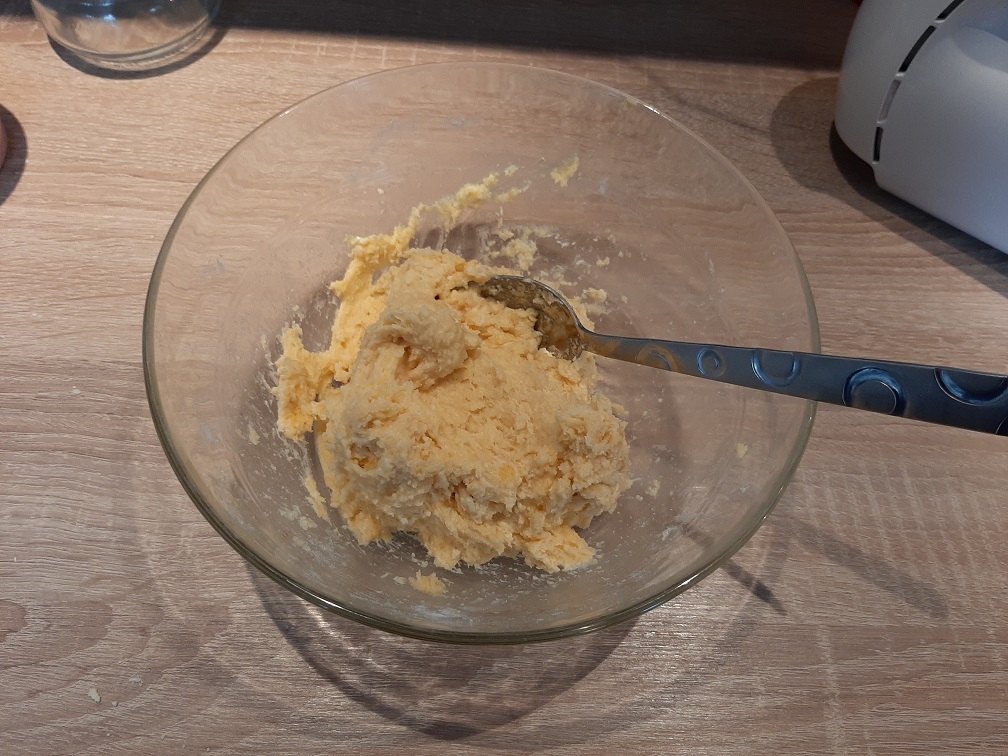 - Une fois que le tout est bien mélangé, ajouter le jaune d’œuf et enfin la farine ;