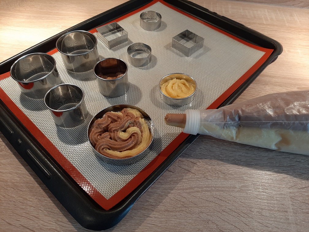 - A l’aide de la poche à douille garnir des cercles posés sur une plaque recouverte de papier cuisson (en commençant par le bord du cercle) ;