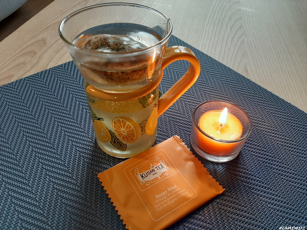 Dans mon calendrier Kusmi Tea j’ai eu un sachet d’une infusion Happy Mind qui est un mélange de plantes, épices et pomme saveur fruit du dragon et citron.