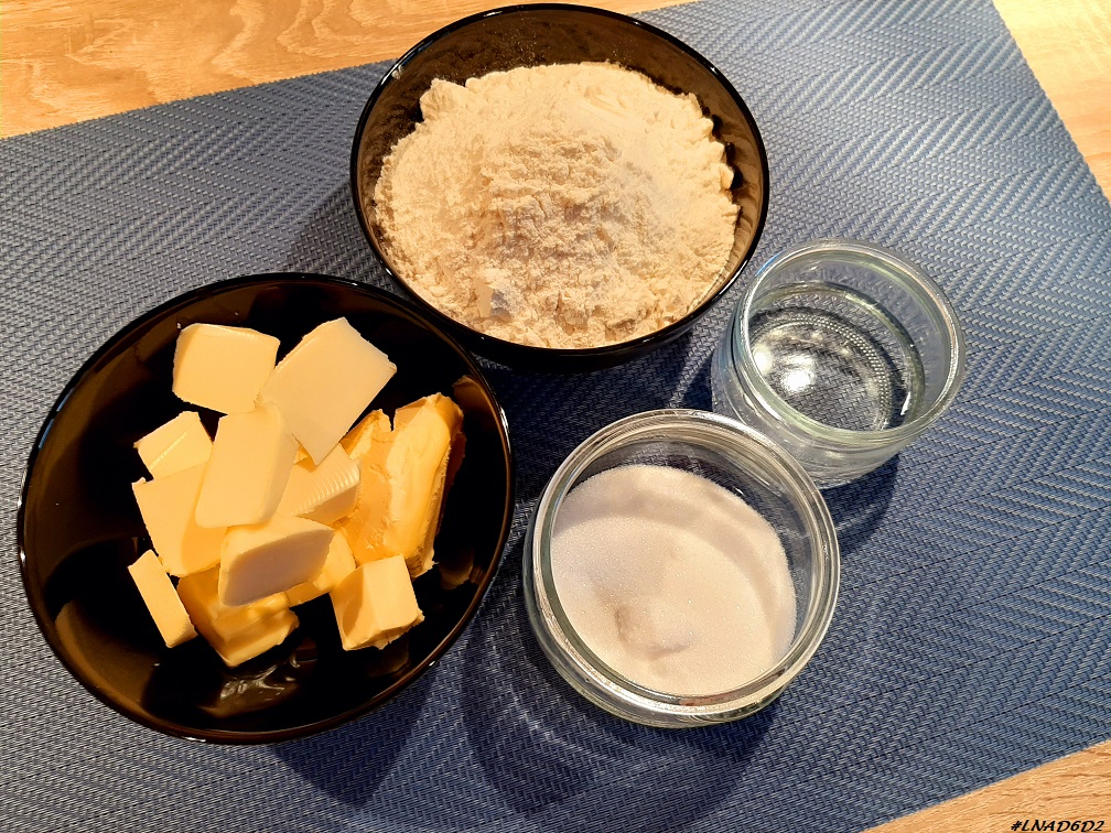• Mélanger le sucre en poudre, la farine et le beurre mou pour réaliser un sablage;