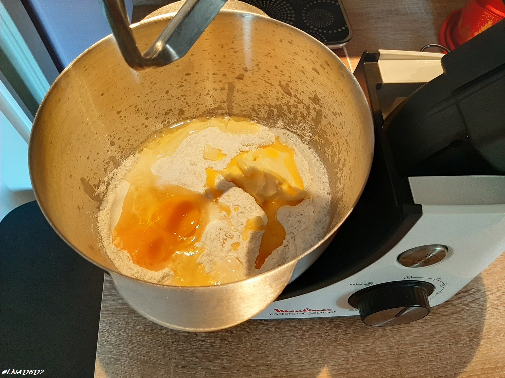 - Verser le mélange précédent dans le bol du robot et y ajouter le beurre, la farine, le sel et les 2 œufs ;