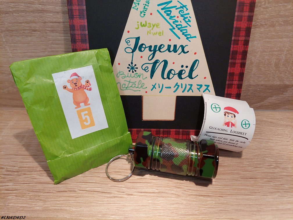 Dans son calendrier Geocaching l’Homme a eu une cache « camouflage » ainsi que son logbook.
