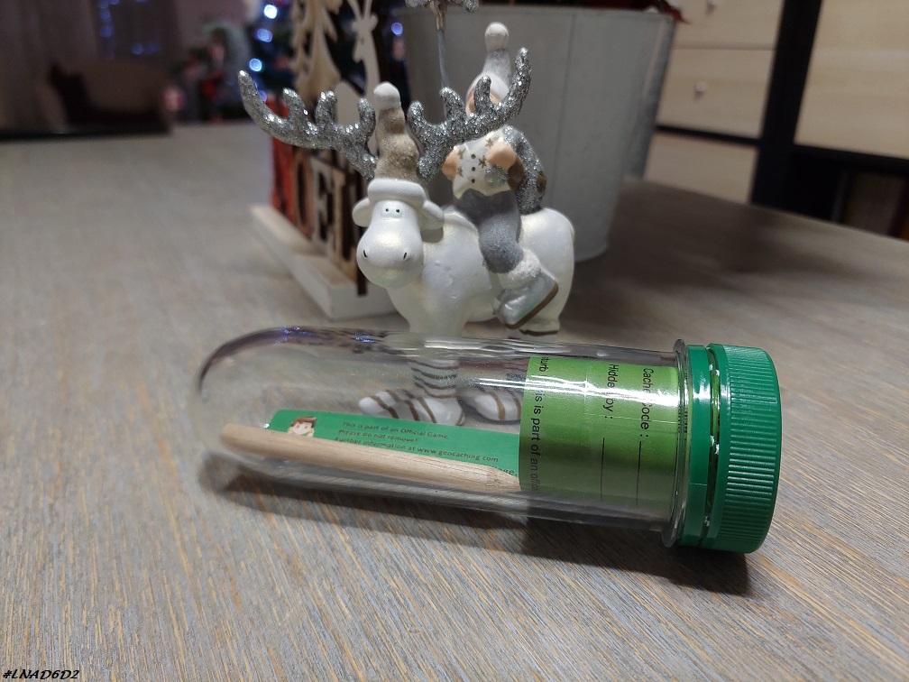 Dans son calendrier Geocaching l’Homme a eu une nouvelle cache, accompagnée de son logbook et d’un crayon.