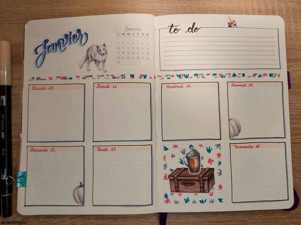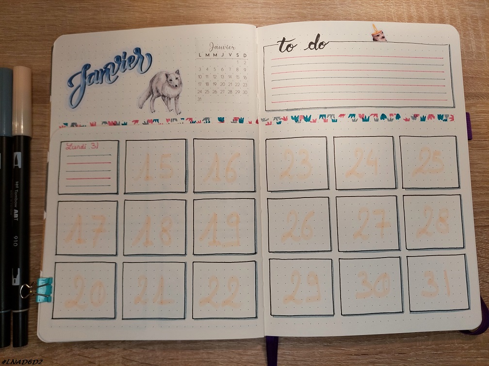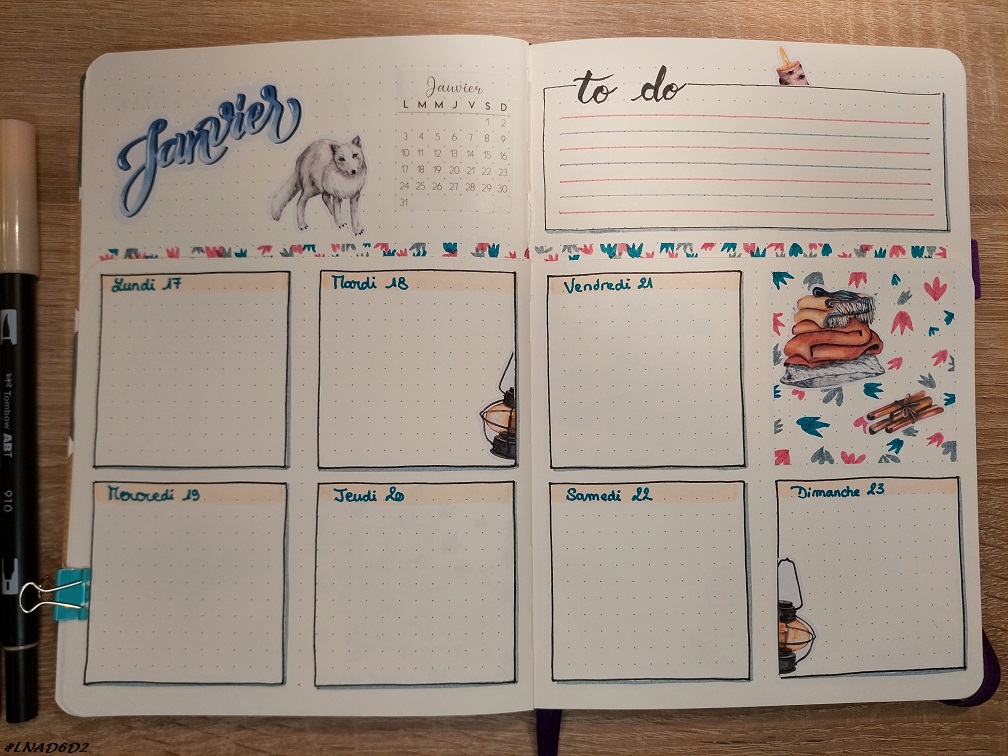 Pour le mois de Janvier, j’ai donc 2 « semaines » de quelques jours. J’ai profité de la place qui y restait pour intégrer des cases pour dessiner chaque jour du mois un petit doodle.