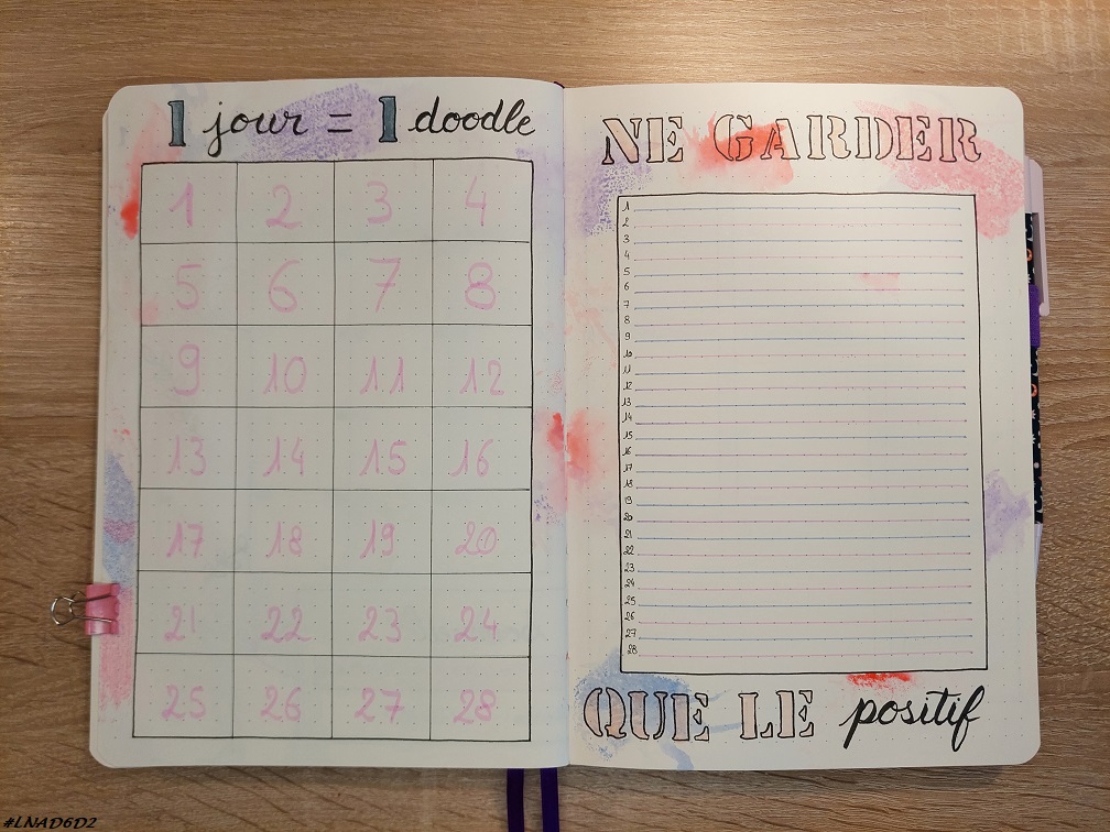 Pour ce mois de Février j’ai conservé mes pages Doodles et Pensées positives que j’ai rassemblées ici sur une double page.