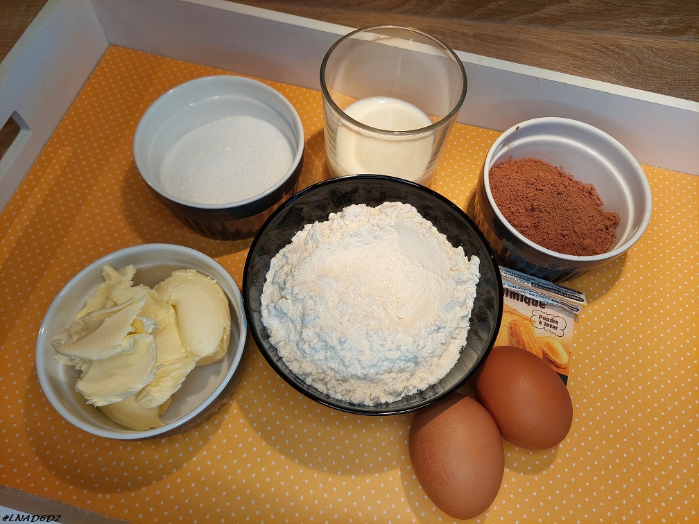 - Ajouter la farine mélangée à la levure, le cacao, le lait et le beurre et mélanger bien entre chaque ajout ;
