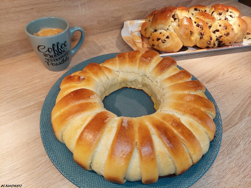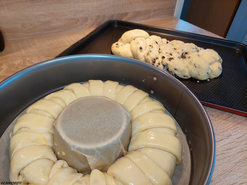 - Dégazer ensuite la pâte, la diviser en deux et former des brioches (j’ai fait une brioche roulée à la pâte à tartiner comme dans la recette d’origine et une tresse avec l’autre moitié à laquelle j’ai ajouté des pépites de chocolat) ;