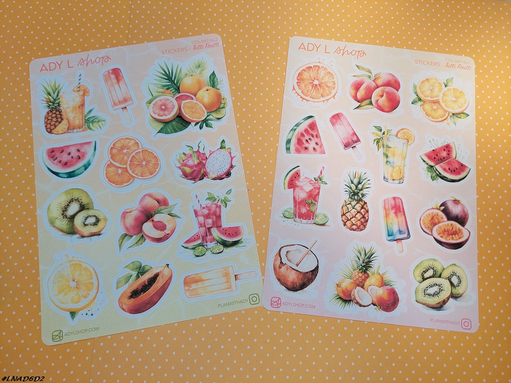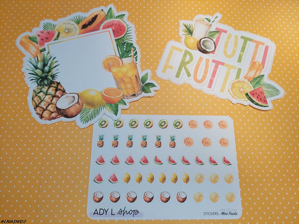 Cette box est composée de la collection complète « Tutti Frutti », disponible sur la boutique. Elle est composée de deux planches d’illustrations, d’une planche « Page de couverture mensuelle », d’une planche « Palette de Couleurs », d’une planche « jours de la semaine » et d’un pack de 12 stickers die-cut.