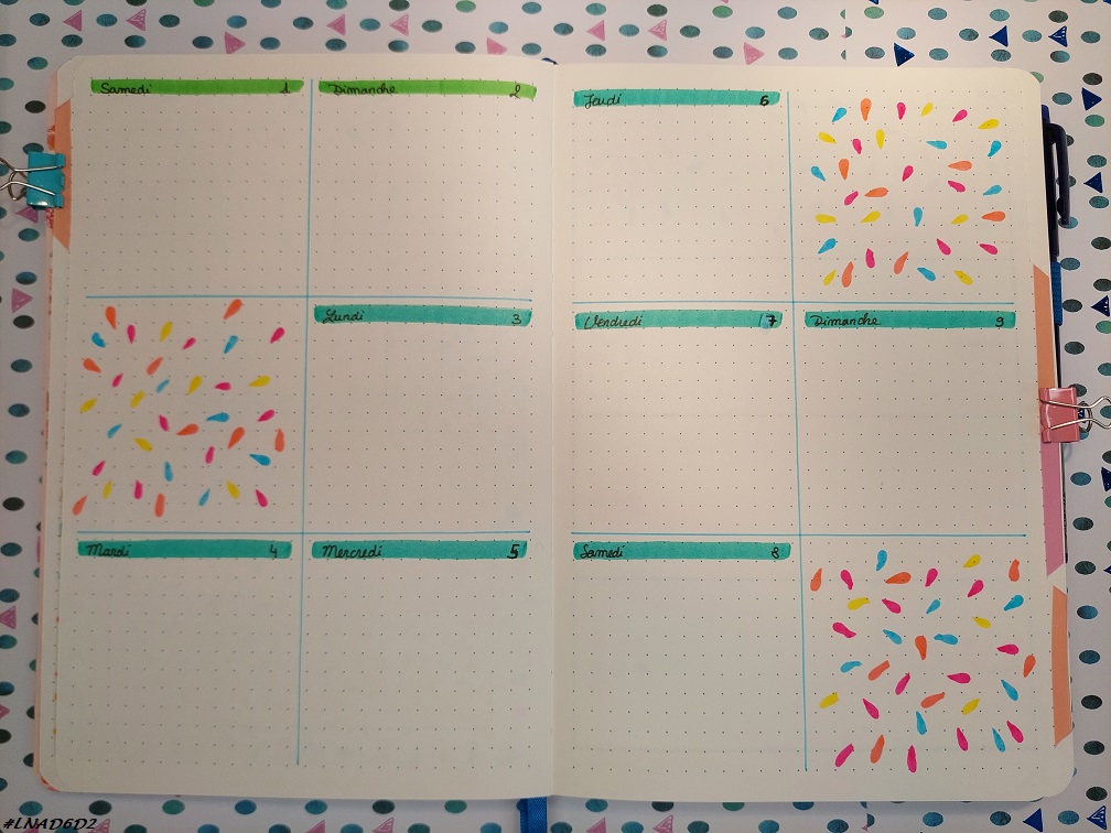 Pour la mise en page du mois de juin qui arrive, j’ai choisi de faire simple. J’ai pris un papier vélin que j’avais en réserve et qui avait de petits confettis colorés, et je l’ai utilisé pour décorer les pages de mon mois de juin en reproduisant ce motif.
