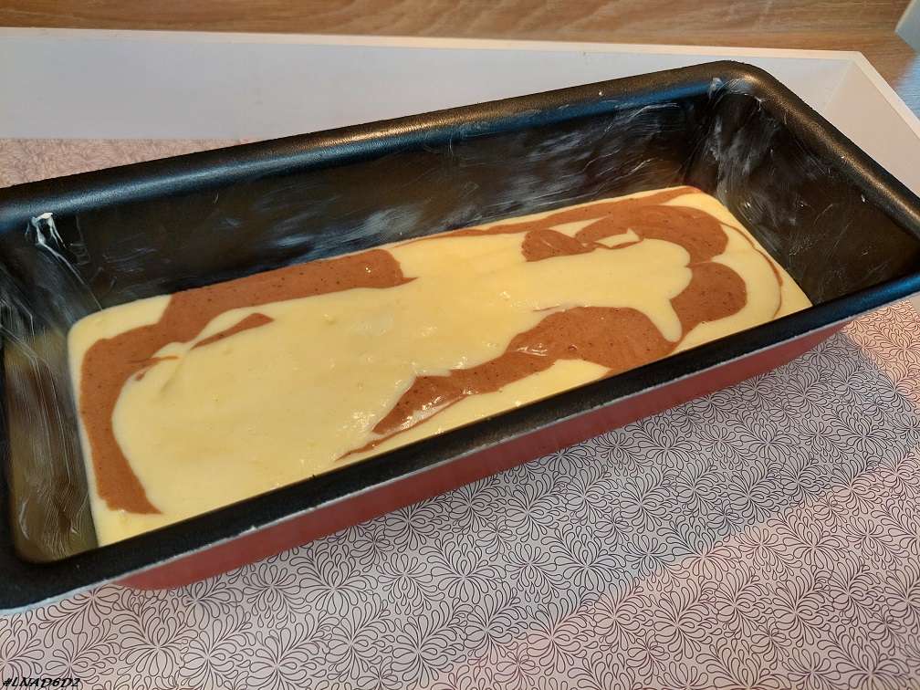 - Beurrer et fariner le moule et y verser les deux préparations en alternant les couches ;