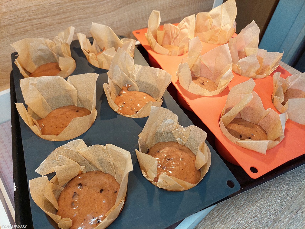 - Verser dans les caissettes à muffins jusqu’au 3/4 ou dans un moule à muffins ;