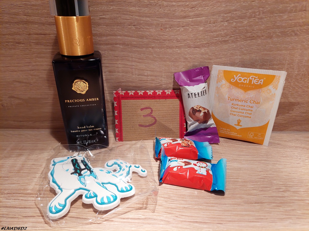 L’Homme quant à lui a eu deux Kinder mini dans son calendrier Kinder, une crème pour les mains Precious Amber dans son calendrier Rituals et un porte-clé dans son calendrier Pokémon.