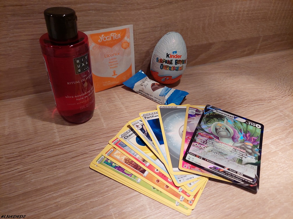 L’Homme quant à lui a eu un Kinder surprise dans son calendrier Kinder, une huile de douche Ritual of Ayurveda dans son calendrier Rituals et des cartes dans son calendrier Pokémon.