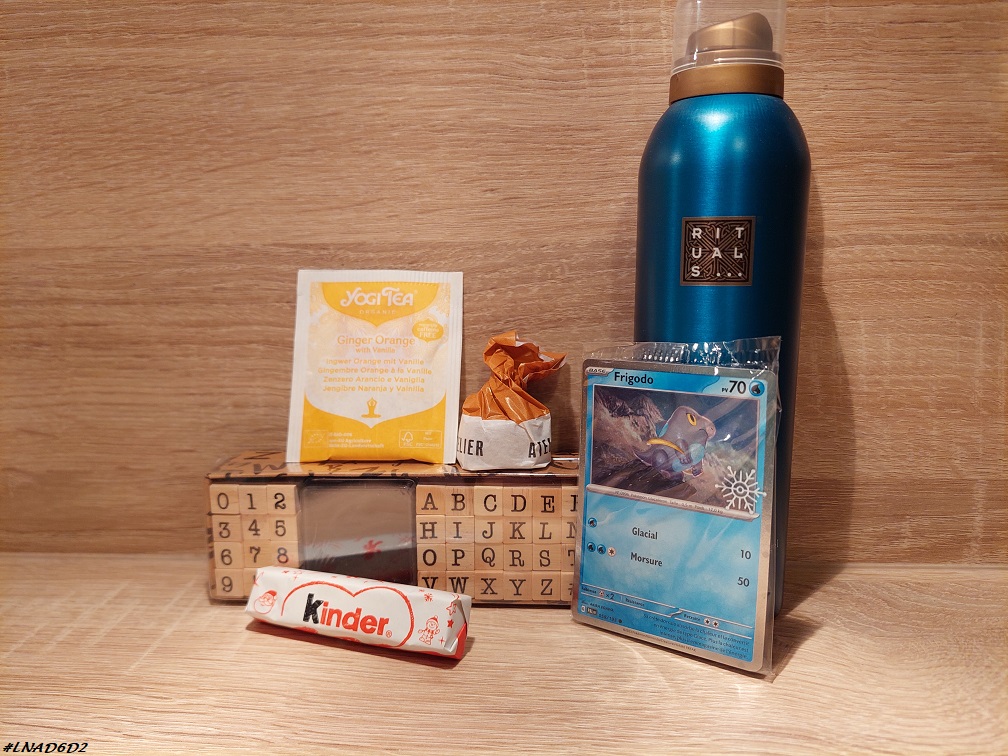 L’Homme quant à lui a eu un Kinder chocolat dans son calendrier Kinder, une mousse de douche Ritual of hammam dans son calendrier Rituals et une carte dans son calendrier Pokémon.