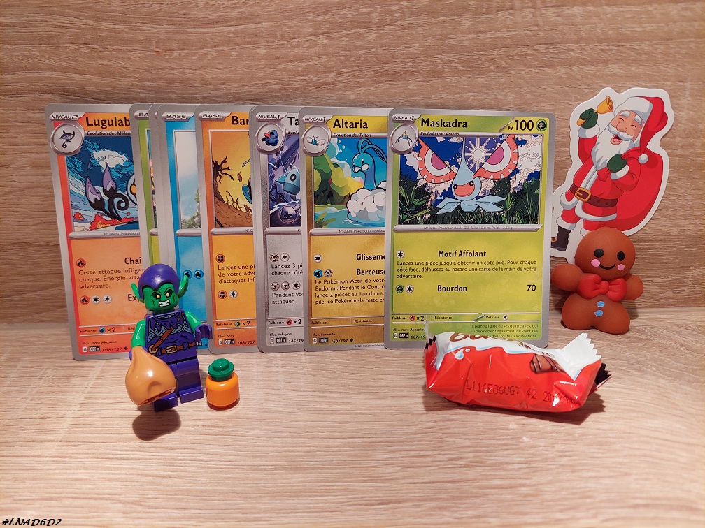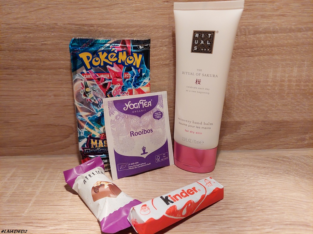 L’Homme quant à lui a eu un Kinder chocolat dans son calendrier Kinder, un baume pour les mains Rituals of Sakura dans son calendrier Rituals et des cartes dans son calendrier Pokémon.