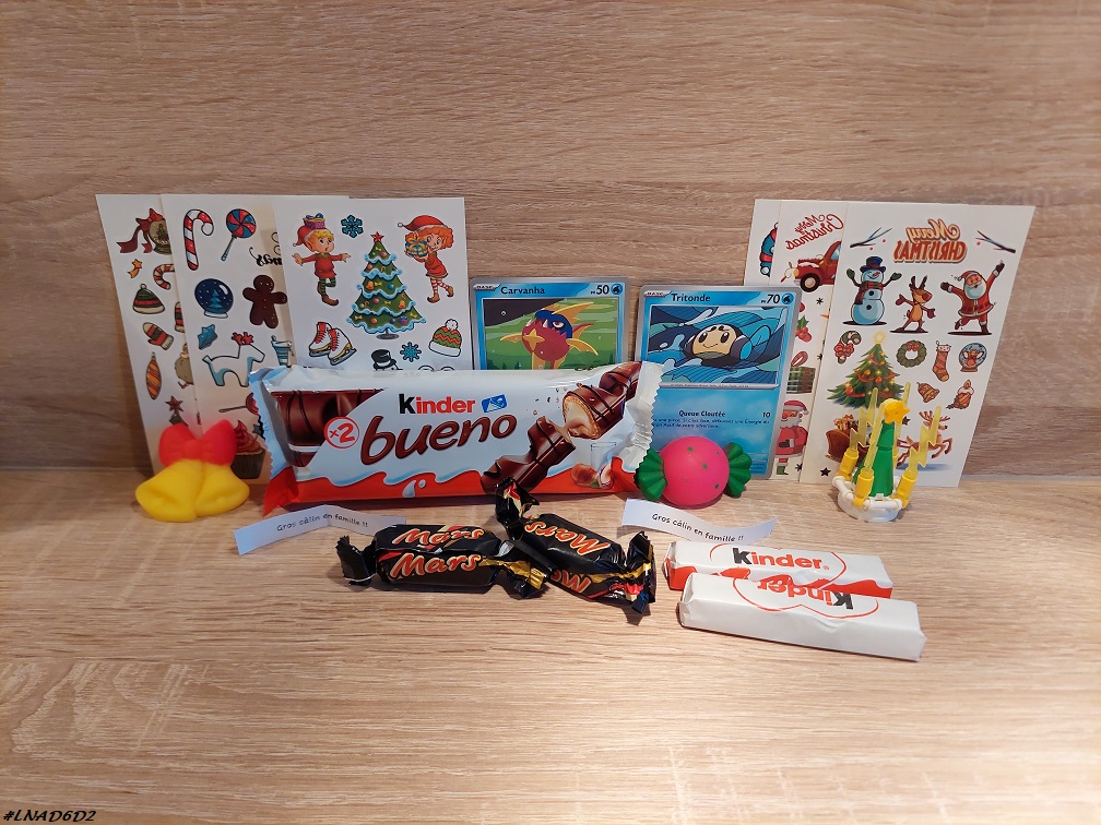 Dans leur calendrier « maison », ils ont trouvé tous les deux un squishy, des chocolats, des tatouages de Noël, ainsi qu’un mot : Gros câlin de famille.