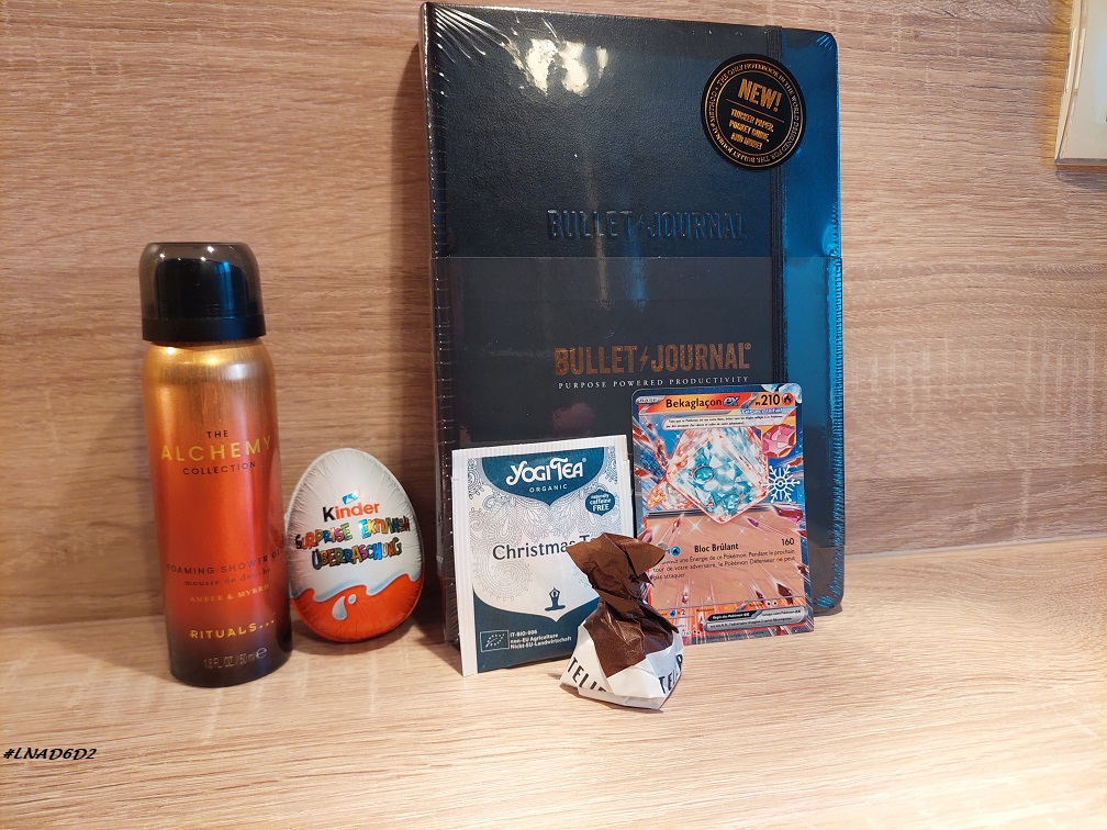 L’Homme quant à lui a eu un Kinder Surprise dans son calendrier Kinder, une mousse de douche The Alchemy Collection dans son calendrier Rituals et une carte dans son calendrier Pokémon.
