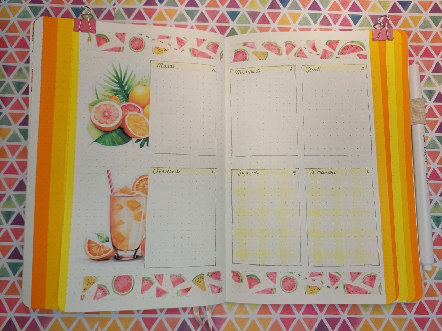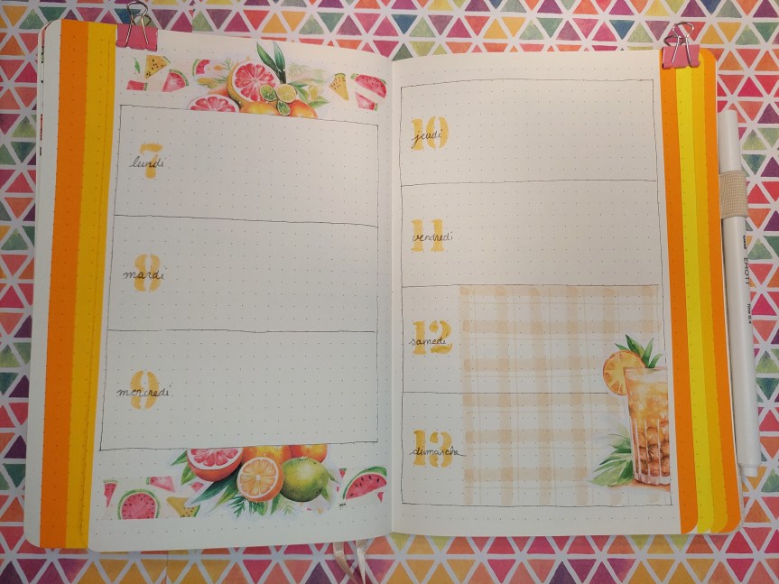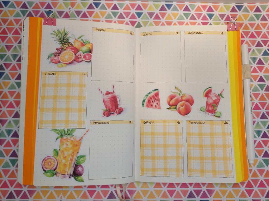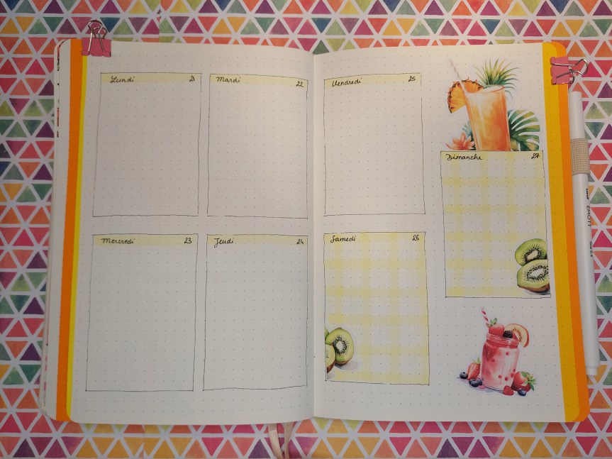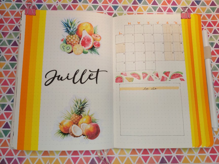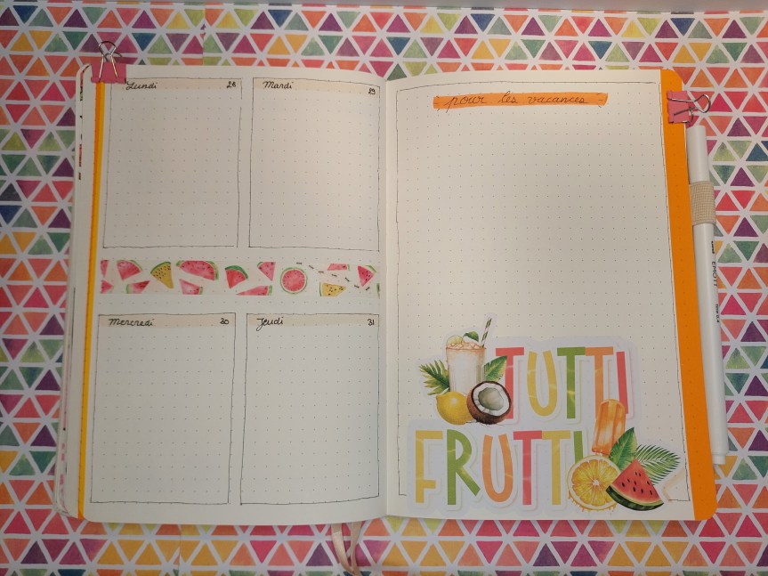 Dans mon bullet journal de juillet, j’ai utilisé des stickers restants de la box d’été de AdyLShop de l’année dernière. J’y ai ajouté des washi tape colorés pour renforcer le peps déjà apporté par les stickers.