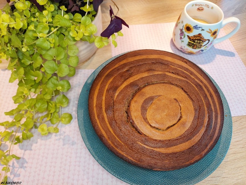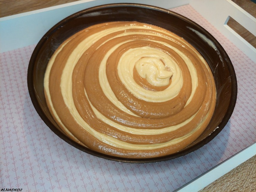 - Dans un moule beurré si nécessaire, alterner les deux préparations à l’aide d’une cuillère à soupe ou d’une louche pour obtenir un effet zébré ;