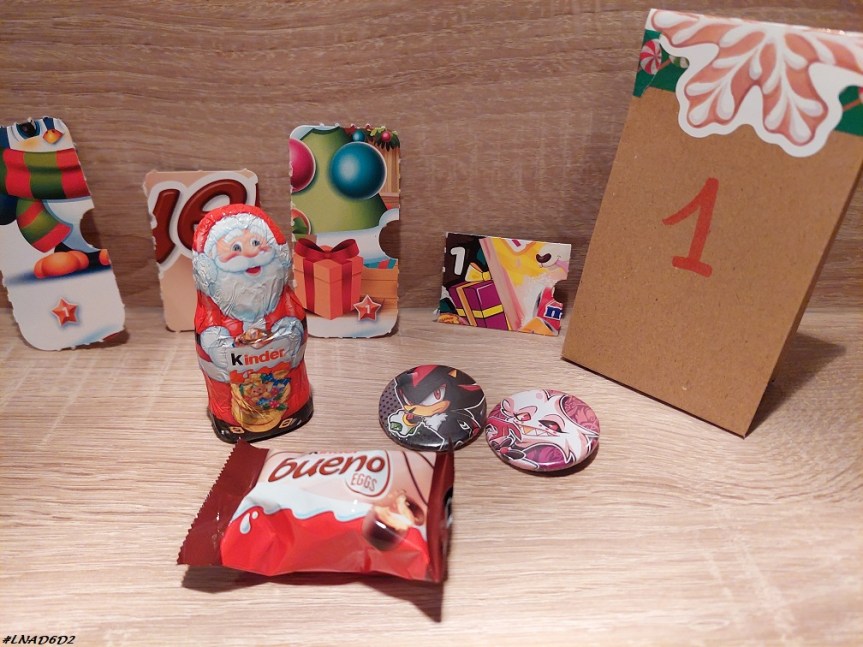 Dans leur calendrier « maison », ils ont trouvé chacun un badge provenant de la boutique Etsy de CyanocittaStudio : Shadow pour l’Asticot et Angel Dust de Hazbin Hotel pour la Mandarine.
