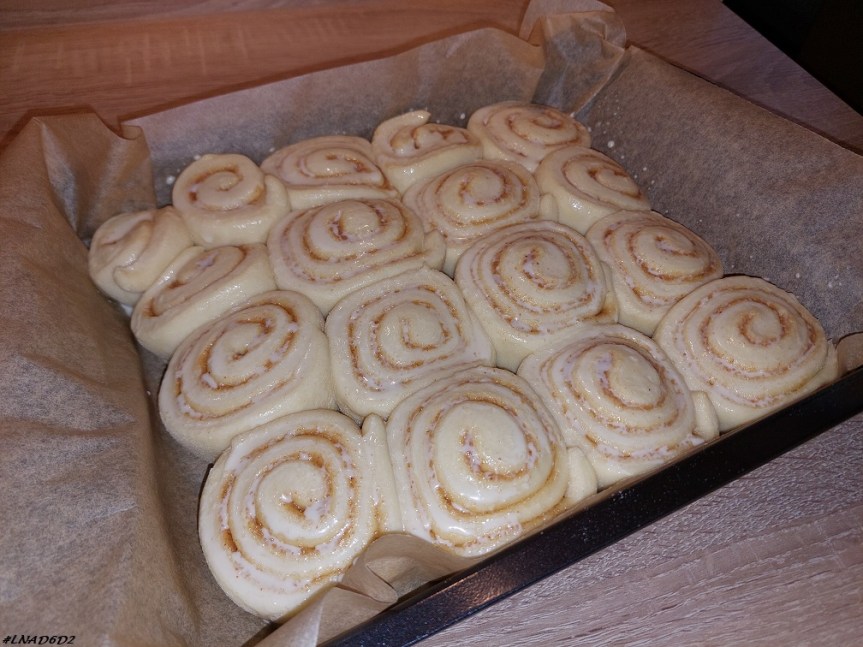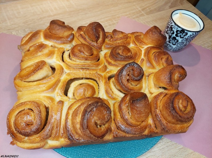 N’ayant pas le courage de façonner les roulés en petits croissants, j’ai préféré rester sur la présentation classique des roulés à la cannelle.