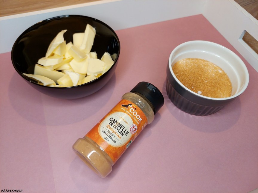 - Dans un bol, mélanger le beurre mou avec la cassonade et la cannelle ;